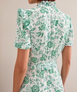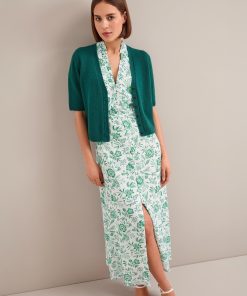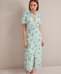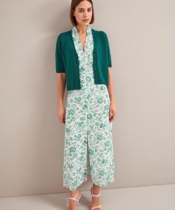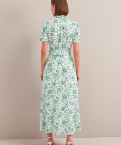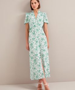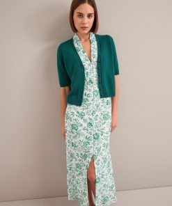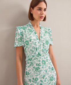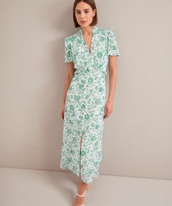The Liliana dress flatters so many figures thanks to its V-neckline, high hip-skimming waist and softly shoulder-defining frill detailing. Designed in a beautifully drapey cotton viscose georgette that’s fully lined, it’s practical as well as pretty – the rouleau buttons are stitched down through the bust and waist to avoid gaping but can be opened at the bottom to show off more leg.
