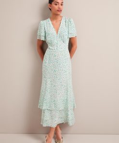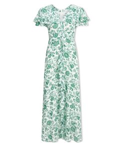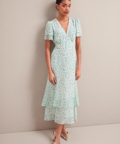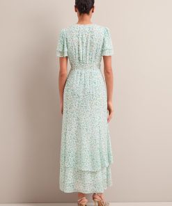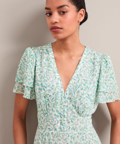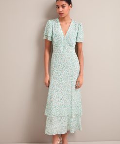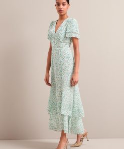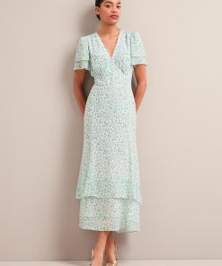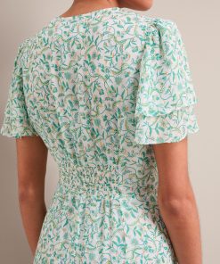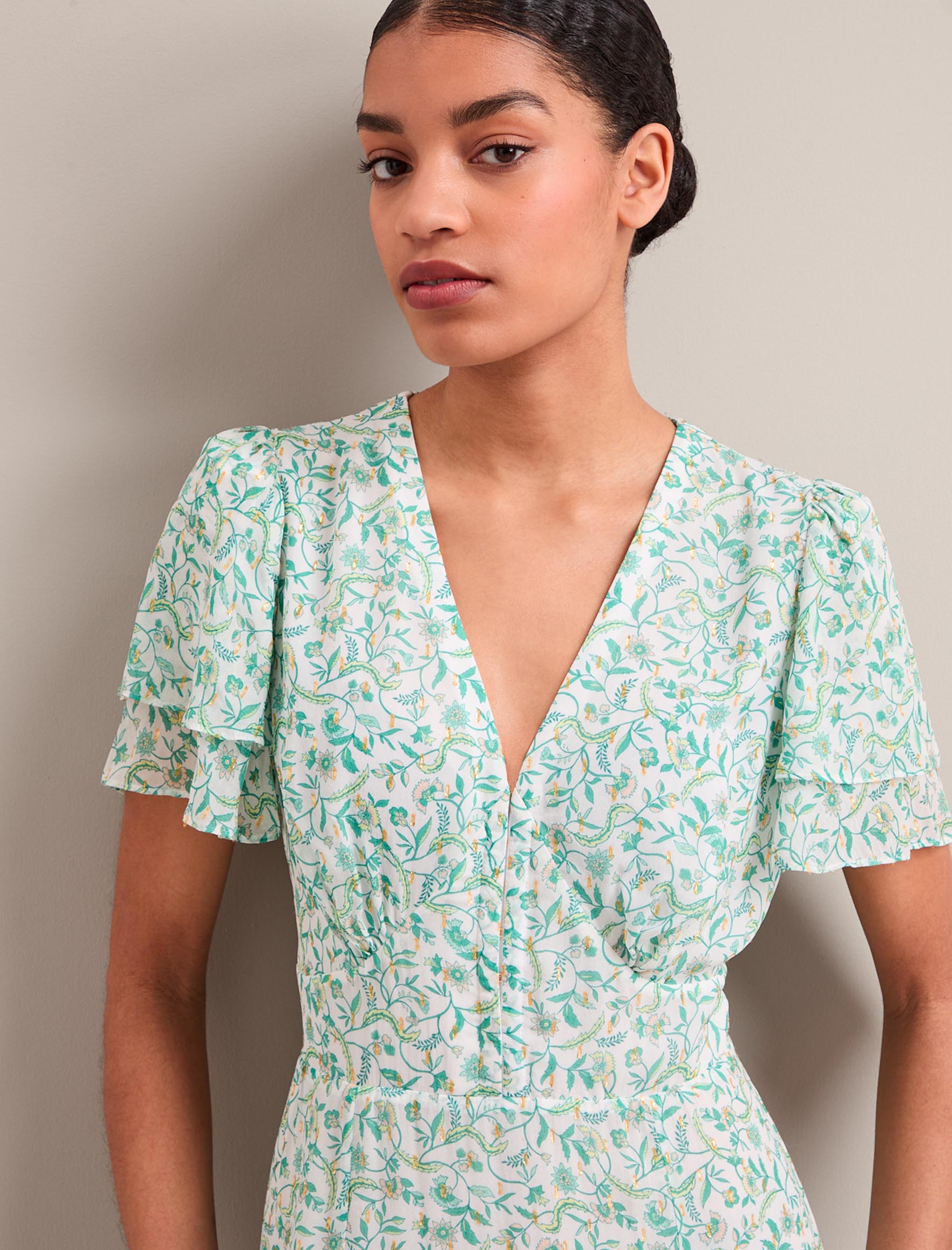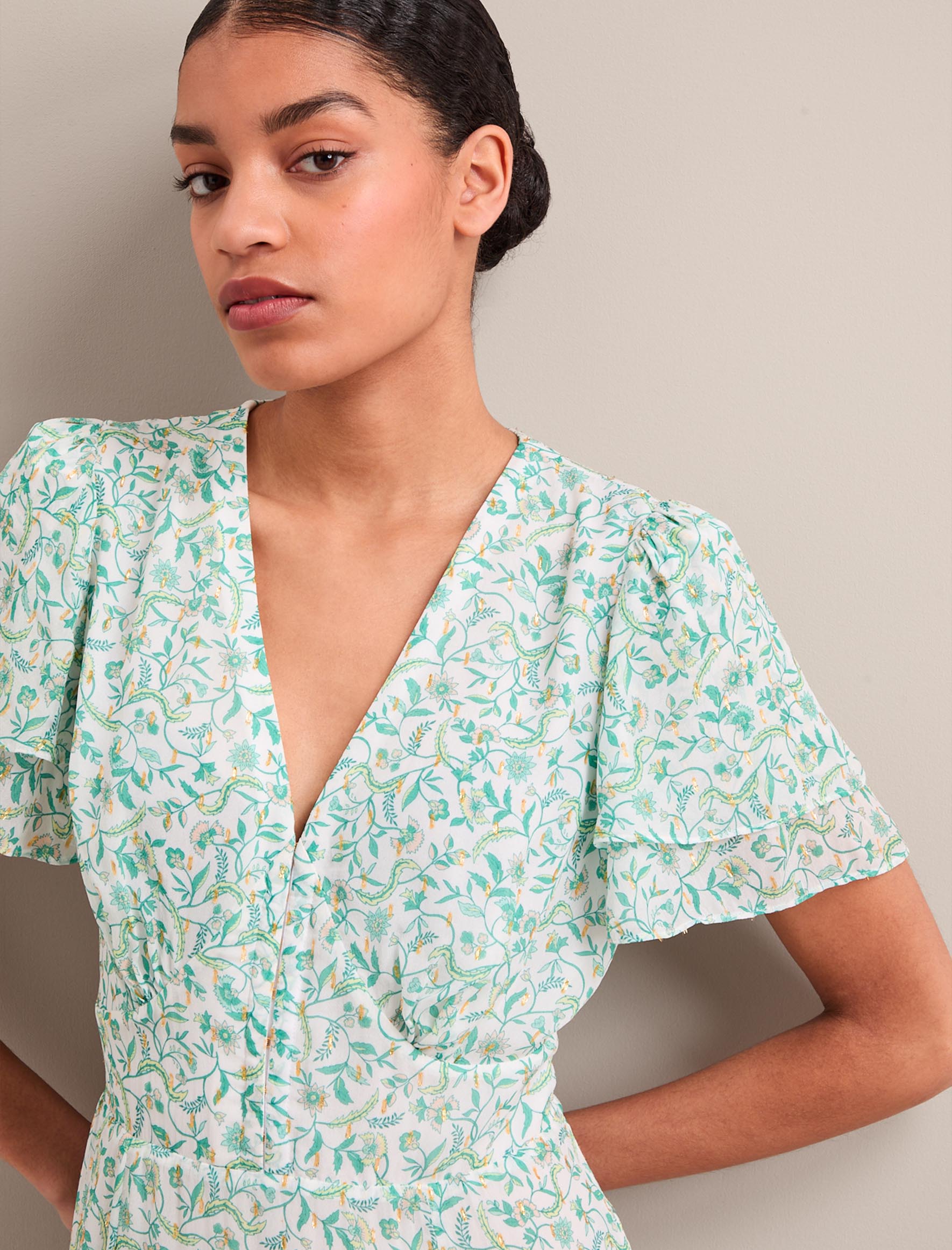 Your perfect plus-one for weddings, parties and summer events, Lotta is designed in floaty georgette with glittering gold fil coupé detailing which shimmers beautifully as it catches the light. Fully lined to prevent transparency, it has a hook-and-eye bodice, pretty fluted sleeves and tiered dipped hem which give it vintage femininity. The shirred back waist makes it as effortless to wear as it is to style – just add gold accessories and you’re good to go.