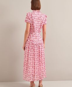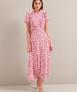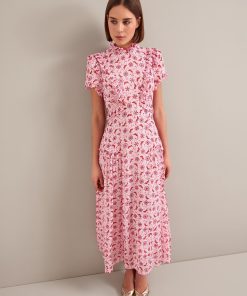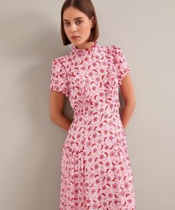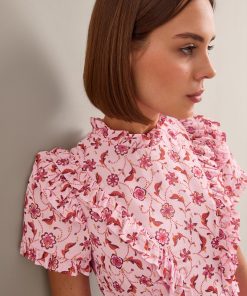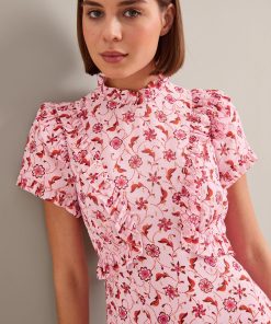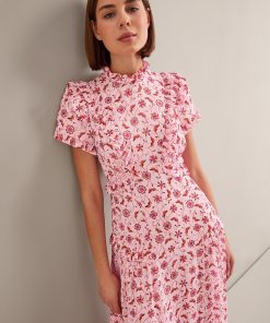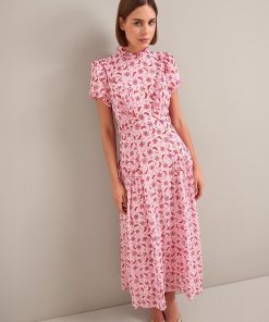 Our sell-out Mirabel dress is back to deliver stand-out status at summer events. Designed in delicate georgette with glittering gold fil coupé detailing to give light-reflecting sparkle, the contouring cut and frill placement makes it incredibly flattering. Fully lined yet light and airy, we have perfected the fit of this season’s iteration with a slightly shorter length to enhance its wearability.
